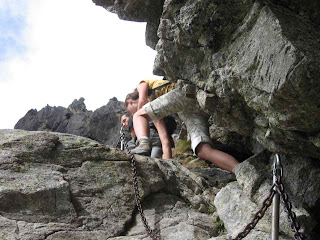 Zejście wcale nie było łatwiejsze. Znów pięć punktów oparcia i jedziemy! Zajechaliśmy ciut za daleko, bo jakiś turysta przed nami zgubił szlak, a my poszliśmy z nim... Na szczęście w porę zorientowaliśmy się, że szlak biegnie inną drogą i udało nam się wgramolić na górę.