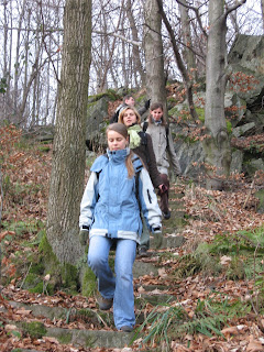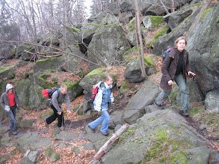 z Domu Turysty nie było niczym przyjemnym – na dworze było jeszcze zimniej niż przedtem. Chwilę zaczekaliśmy na Anię i ponownie weszliśmy w las, gdzie było o wiele przyjemniej. Droga znów często przerywana postojami przeznaczonymi na wykłady i naigrywanie się z archeologów. A było o czym opowiadać: „wały kultowe”, Święte Źródełko, Skały Władysława, Źródło Anny... Paweł miał bardzo dokładną mapę, na której były zaznaczone nawet jakieś przewody elektryczne, po przejrzeniu której stwierdził, że nie ma sensu iść zygzakami, leśnymi drogami i ścieżkami, skoro można przejść kawałek przez las i wyjść na drogę bez robienia dodatkowych kilometrów. Tak też zrobiliśmy. Przedzieraliśmy się przez las, gdzie pod grubą warstwą liści kryły się liczne szczeliny, w które co poniektórzy zapadli się aż po kolana.