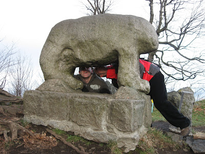 A niżej czekał nas sławny, ślężański niedźwiadek (a może dzik?). Jako że są wątpliwości co do tego, jakie to jest właściwie zwierze, my założyliśmy, że wilk, a raczej wilczyca. A oto nasi Remus i Romulus (Kamil i Mariusz):