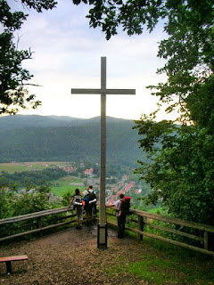 Szlak prowadził nas koło Jaskini Radochowskiej, ale jako że nikt nie wyraził chęci jej zwiedzania (większość już tam była), minęliśmy ją bez zatrzymywania się. Dalej szliśmy przez Przełęcz Leszczynową i Przełęcz Kłodzką, a później przez kalwarię do Barda. Tam miały czekać na nas Magda i Ewa. Spod widocznego z Barda białego krzyża obserwowaliśmy pociąg, którym przyjechały nasze koleżanki i im machaliśmy, mając nadzieję, że może to zauważą. Szybko zeszliśmy na dół i już w dziewiątkę powędrowaliśmy do miejsca noclegu: Brzeźnicy.