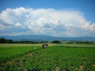 Zasadnicza wędrówka zaczęła się w Długopolu. Po przejściu krótkiego odcinka lasem, zaczęły się rozległe, zalane słońcem pola. Poranna rosa i błoto, które było jedynym śladem rozdmuchanej przez media powodzi, szybko przemoczyły mi buty, ale nie był to powód do zmartwień.