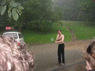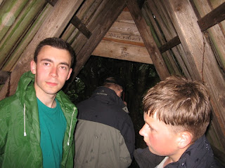 w której można przeczekać deszcz. Kiedy Radek krzyknął, że idzie na nas ściana deszczu, błyskawicznie zebraliśmy się i pędem ruszyliśmy na dół. Zdążyliśmy idealnie: kiedy padły pierwsze krople deszczu, my akurat dochodziliśmy do owej wiaty. W środku czekała nas jednak niemiła niespodzianka: ktoś potraktował tę niewielką, drewnianą konstrukcję jak toaletę, przez co my zachowywaliśmy się, jakbyśmy byli na polu minowym. Jakoś udało nam się zmieścić i już niebawem mogliśmy obserwować burzę, której towarzyszyły strugi deszczu. Drogi i schody zamieniły się w błotniste potoki. Radek nie lubi marnotrawstwa wody. Istniało duże prawdopodobieństwo, że tego dnia nie będzie możliwości umycia się, więc wyciągnął mydło i potraktował deszcz jak prysznic. Tuż po ulewie za ciepło nie było, więc panowie na rozgrzewkę zrobili sobie kilka pompek.