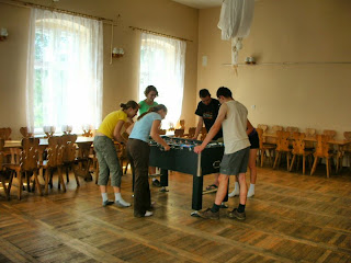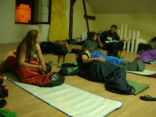 Spaliśmy w świetlicy, która służyła za weselną salę. Panie z koła gospodyń wiejskich przywitały nas herbatą i smalcem – to bardzo miły gest z ich strony, a jeszcze sympatyczniejsze było to, że dziewczynom zaproponowano spanie na materacach zamiast podłogi, co po poprzedniej nocy było miłą odmianą. Na sali stała gra, znana jako „piłkarzyki”. Wciągnęła nas na długo, a Magda okazała się w tym mistrzynią. Ponadto było jeszcze pianino, z którego Kamil potrafił zrobić użytek. Paweł mimo wszystkich przeszkód usiłował pogrążyć się we śnie, ale wyszło mu to dopiero kiedy zapaliliśmy świeczkę i zasiedliśmy gdzieś przed pierwszą do stołu by zagrać w mafię. Klimat był idealny, ale niestety dała o sobie znać senność i po dwóch rundach podziękowałam za grę. Reszta posiedziała jeszcze półgodzinki dłużej.