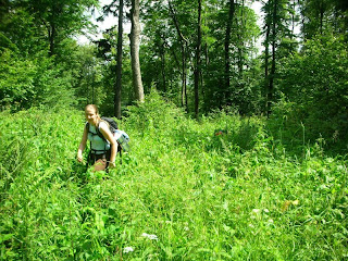 Gdzieś na leśnej drodze, przy której płynął strumień, Kamil znalazł kamień, który klasyfikował jako ametyst. Później zboczyliśmy ze szlaku na poszukiwania większego kamienia, a konkretniej jakiejś tam skały, która miała być tuż tuż, ale zamiast niej znaleźliśmy burzę. Chmura krążyła po okolicy i nawet udało jej się trochę nas zmoczyć, ale uciekliśmy przed zasadniczą ulewą.
